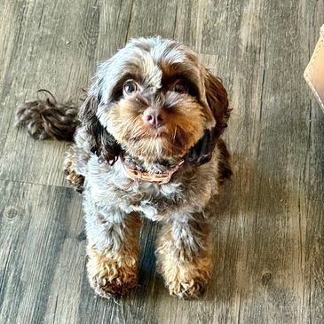 Roxi is our sweet and beautiful chocolate Merle F1b Mini Cockapoo Momma! She’s about 15lbs and has a wavy coat. She has produced one gorgeous litter For us so far and we look forward to her future! 💕